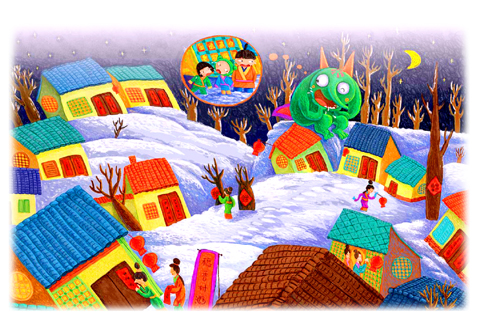 不幸的是,只有一個節日會破壞他們的興致;每年一開始時,一個可怕的怪獸會從躲藏的地方跑出來。如果牠只是出來嚇嚇人也就罷了,可是牠有個恐怖的習慣:因為牠一整年都在冬眠,所以一年只須進食一次,而牠最想吃的就是小孩!(明日待續...)