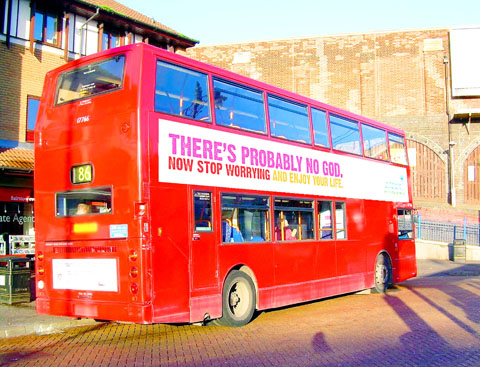 「上帝或許並不存在,所以別煩惱了,盡情享受生命吧!」這句標語 ,可能很快就會成為倫敦紅色巴士的特色。這是無神論者為了回應一系列基督教廣告而發起的一項廣告活動。