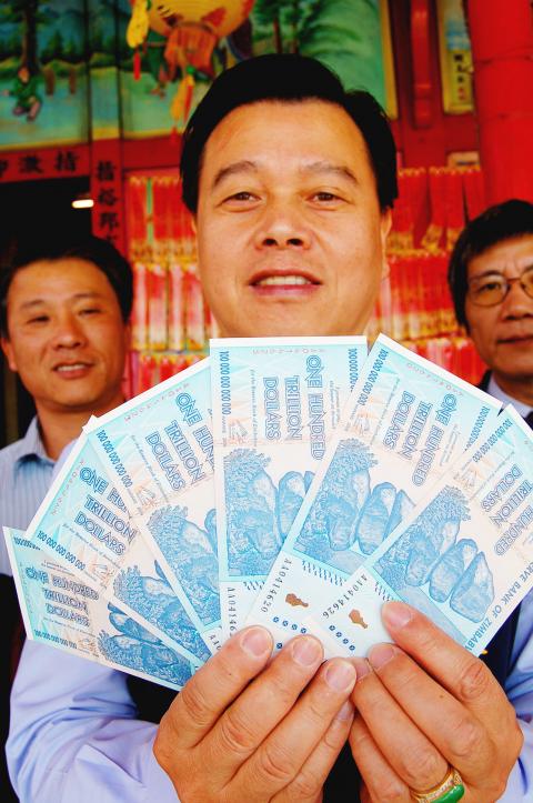 The ninth day of the first month in the lunar calendar is the birthday of the Jade Emperor, the supreme divinity in Chinese mythology. Jhihtian Temple, which honors the Jade Emperor, planned a series of events to mark the day. When a friend of temple committee chairman Yang Pi-tsun gave him the 100 trillion Zimbabwean dollar banknotes, he was taken aback and said “What? 100 trillion?” He decided to put 100 of the banknotes in red envelopes as gifts for people who came to the temple to cast divination blocks. Some devotees were surprised at the sight of 14 zeros on a single banknote, saying that this was the first time they had ever seen a banknote with such a big denomination. The highest-denomination banknote in Taiwan is NT$2,000.