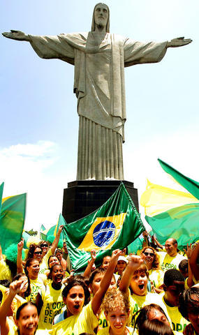 Another jersey, bearing the same slogan, was hung below the Christ the Redeemer statue that sits atop Corcovado mountain, while about 100 flag-bearing dancers performed at the statue's base.