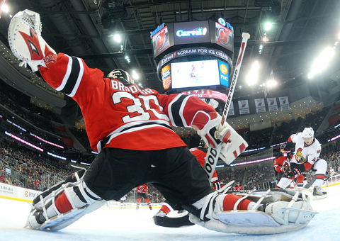 Jamie Langenbrunner and Brian Rolston also scored for the Devils to support Brodeur, who overcame a collision with Ottawa’s Jonathan Cheechoo in the second period that left the goaltender laid out on the ice for several minutes.