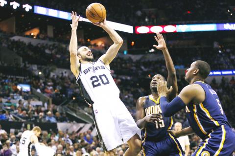 Manu Ginobili had 28 points as the San Antonio Spurs won without coach Gregg Popovich, rallying for a 106-100 victory over the Indiana Pacers on Wednesday night.