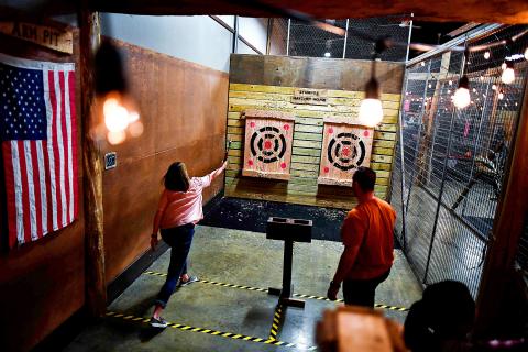 On a busy Friday night at Stumpy’s Hatchet House in New Jersey, it sounds like this: the thud of the blade sticking into a wooden target, people cheering a good toss and a bell ringing out when somebody scores a bull’s eye.