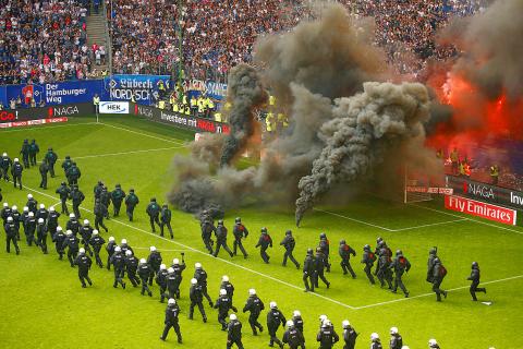 Most fans reacted with anger to the disturbances, chanting: “We are the people of Hamburg and you’re not!” and “Get them out!”