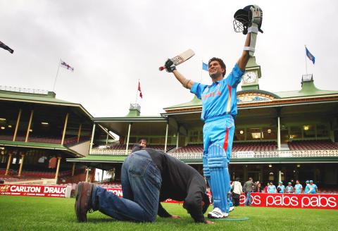 An Indian cricket fan venerates a wax figure of Indian cricketer Sachin Tendulkar during a promotional event at the Sydney Cricket Ground yesterday. A group of Indian cricket supporters known as the “Swami Army” attended the unveiling of the wax figure, which will go on permanent display at Madame Tussauds wax museum in Sydney.Apr 21, 2013