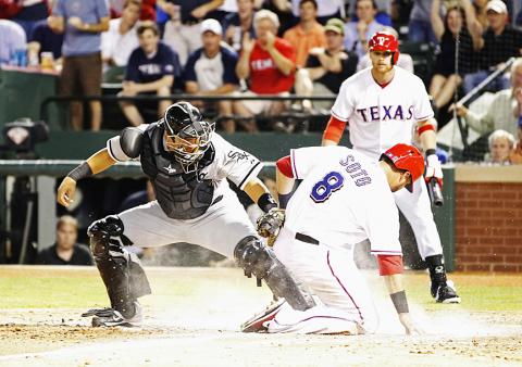 The Texas Rangers’ Geovany Soto, right, is safe at home on a hit by teammate Mitch Moreland as Chicago White Sox catcher Hector Gimenez, left, attempts to apply the tag in their American League game in Arlington, Texas, on Tuesday.May 02, 2013