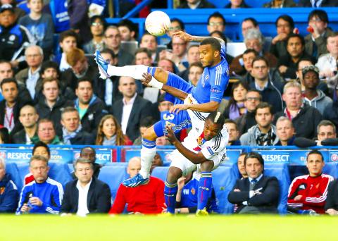 Basel’s Serey Die, bottom, battles for the ball with Chelsea’s Ryan Bertrand in their Europa League semi-final second leg in London, England, on Thursday.