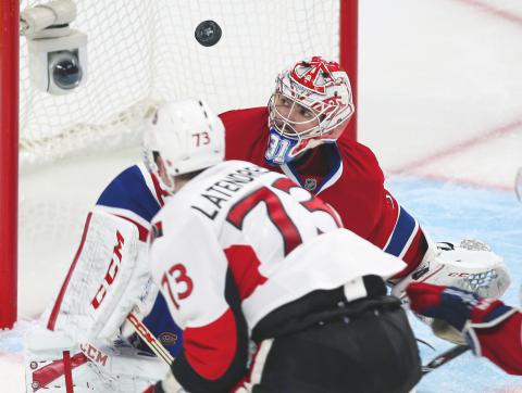 Montreal Canadiens goalie Carey Price, right, keeps his eyes on the puck following a shot by Guillaume Latendresse of the Ottawa Senators in the second period of their Stanley Cup playoff game in Montreal, Canada, on Thursday.May 04, 2013