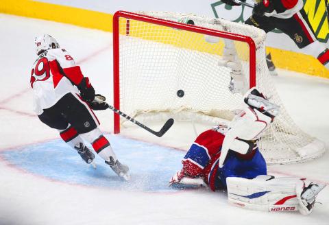 The Ottawa Senators’ Cory Conacher, left, scores on Montreal Canadiens goalie Peter Budaj in the first period of Game 5 of their NHL Eastern Conference quarter-final playoff series in Montreal, Canada, on Thursday.May 11, 2013