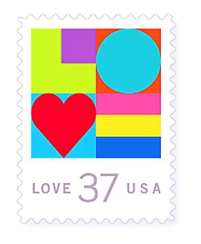 The 2002 Love Stamp, which was designed by Michael Osborne Design Company, a noted branding design firm in San Francisco, features abstract geometric letters in bright playful colors, and very closely resembles Hao's design in layout and color.