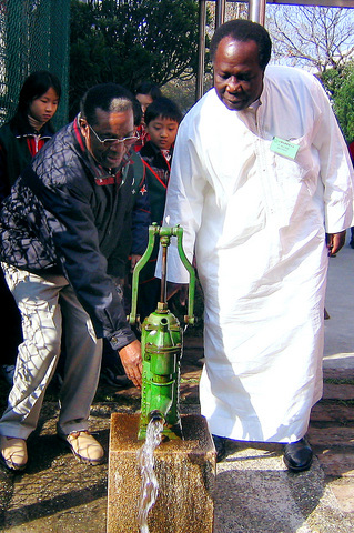 "The rainwater catchment system is an excellent and practical idea. Take the hand pump I see here for example: in my country, we practically always use hand pumps to pump water," said Malawian ambassador Thengo Maloya during the visit to Taipei County Shengkeng Elementary School, whose rainwater catchment system recycles two tonnes of wastewater per day.