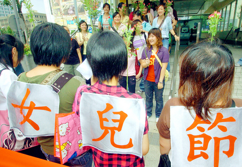 Led by the Garden of Hope Foundation, a group of teenage girls between the ages of 12 and 16 yesterday participated in a "flash mob," making sudden appearances in Ximending, Shin Kong Mitsukoshi Mall, then at the Legislative Yuan to drum up support for a day of their own by chanting "We want Daughter's Day!"