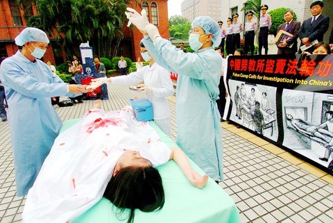The group performed a play showing how organs were harvested from living bodies at a press conference in front of the Legislative Yuan yesterday.