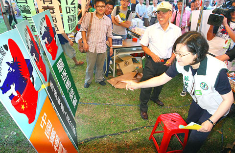 Addressing the crowd, DPP Chairwoman Tsai Ing-wen (蔡英文) said the nation needs a strong DPP to supervise the Chinese Nationalist Party (KMT) government, adding that DPP legislators would continue to keep the government and its China-leaning policies in check.