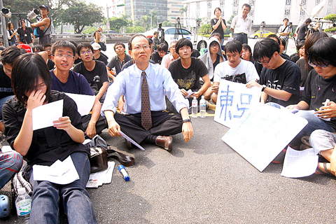 The students began the sit-in on Thursday morning with a petition demanding that President Ma Ying-jeou (馬英九) and Premier Liu Chao-shiuan (劉兆玄) apologize for the excessive use of force by police, that National Police Agency (NPA) Director-General Wang Cho-chiun (王卓鈞) and National Security Bureau Director Tsai Chao-ming (蔡朝明) step down and that the government scrap the Assembly and Parade Law (集會遊行法).