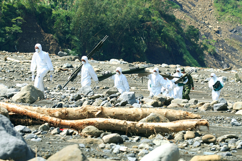 Clad in biochemical protective suits and masks, yesterday morning two dozen soldiers from Army Troop 542 traversed the rapid Nantzuhsien River (楠梓仙溪) to the site of Jiaxian Township’s (甲仙) Xiaolin Village (小林), Kaohsiung County, to retrieve three bodies that were discovered on Tuesday.