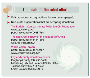 The aid, which includes a NT$10,000 consolation fund and a NT$20,000 flood subsidy for every household, would be given to a total of 8,306 families, the government said, adding that those without identification documents could still receive money if a township, village or borough government employee could identify the person.