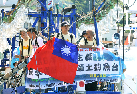 Chung Hwa Baodiao Alliance executive director Huang Hsi-lin (黃錫麟) and alliance member Yin Pi-hsiung (殷必雄) set sail on a 10-tonne fishing boat with a captain and two crewmembers from Yeliou Harbor (野柳), Taipei County, at 3:55pm.