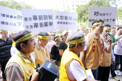 The protesters, led by candidate for Taipei City councilor Chen Teh-sien (陳德賢) of the Taiwan Solidarity Union, were mainly from Datong (大同) and Zhongshan (中山) districts. They said the Civil Aeronautics Administration (CAA) had promised it would compensate 100 households living in the designated noise control zone every year by installing soundproof facilities.