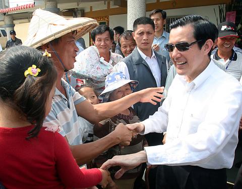 Accompanied by Council of Agriculture Minister Chen Wu-hsiung (陳武雄), Chinese Nationalist Party (KMT) Legislator Wong Chung-chun (翁重鈞) and former Chiayi County commissioner Lee Ya-jing (李雅景), Ma visited an award-winning rice farmer, Chuang Yu-chih(莊有志), in Putzu City (朴子) to take a look at his crop.