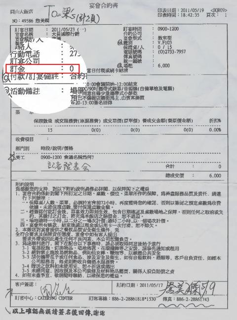 “It’s marked here that the deposit is ‘zero,’ and that the total price is NT$6,000 [US$207], and it’s written here that ‘the contract is confirmed, the remaining payment to be paid in full in cash or by credit card on the day [of the event],” Chow said, as she pointed to the document, adding that it was also written on the contract that the purpose of the rental was for a press conference.