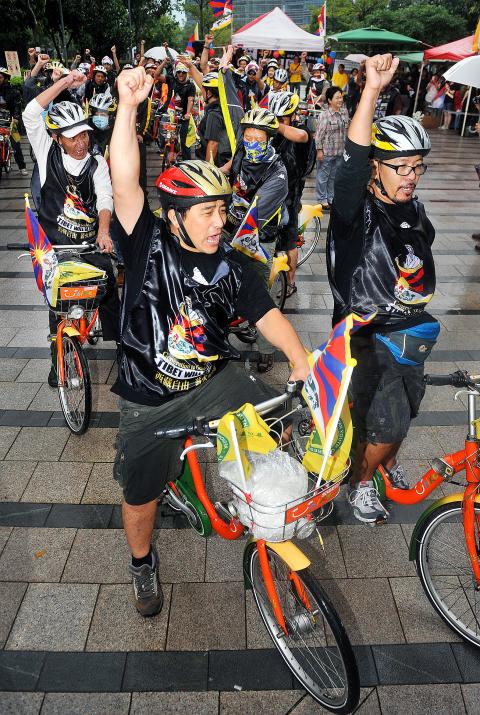 Despite stormy weather conditions in Taipei yesterday, 49 people —Tibetans and Taiwanese alike — staged a bicycle rally in the city to commemorate Tibetan monks who set themselves alight to protest China’s rule of Tibet.