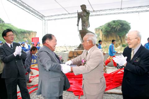 Braving strong winds, rain and waves pounding the shore, officials and residents from Keelung and Japan’s Okinawa Prefecture yesterday jointly unveiled a statue of an Okinawan fisherman with cheers, music and words of friendship to commemorate Okinawans who died during the 228 Incident.