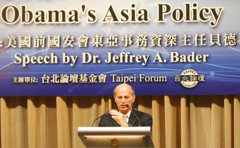 Taiwan’s security is important for multiple reasons, because “Taiwan should not be compelled to a status against the wishes of its people” and the use of force against Taiwan by China would have “profound negative impacts” in the region, Jeffrey Bader, former senior director for East Asian Affairs on the US National Security Council (NSC), said in a speech titled: “Obama’s Asia Policy” at an event held by the Taipei Forum Foundation in Taipei yesterday.