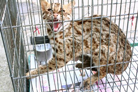 The association said it found the leopard cat on Cianshan (淺山) in Gongguan with its right front leg caught in a trap. Association director Lin Ching-chi (林清棋) alerted the county’s Agriculture Department and sent the leopard cat to a veterinarian.