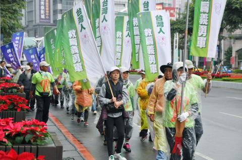 The walk, initiated by the Alliance of Referendum for Taiwan, arrived at Banciao Railway Station in New Taipei City (新北市) yesterday morning. They braved the cold and rain, and at noon reached Ketagalan Boulevard in front of the Presidential Office in Taipei, where an overnight protest was scheduled.