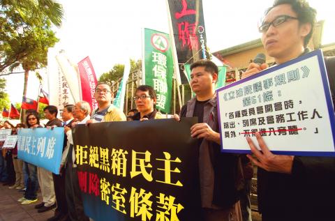 “Taiwanese should not be stripped of their constitutionally protected right to political participation,” Citizen Congress Watch chairman Shih Shin-min (施信民) said before the protesters tried to enter the legislature and apply for temporary media passes.