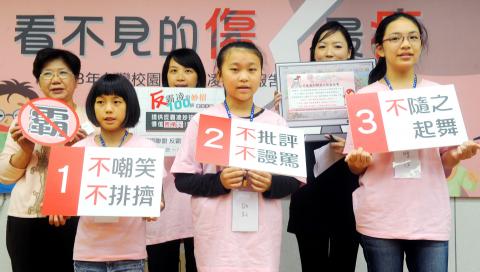 Children’s Welfare League Foundation research and development director Chiu Ching-hui (邱靖惠) said that relational bullying often involves the intentional social exclusion of a victim or spreading rumors to ruin the victim’s social networks, and can cause the victims to feel detached and depressed.