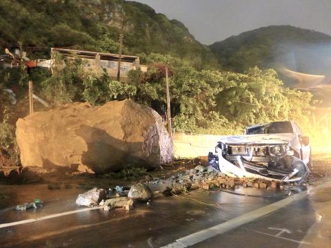 Also on Beining Road, a large boulder yesterday crashed down onto the road going out of Keelung City toward New Taipei City’s (新北市) Ruifang District (瑞芳) narrowly missing a white sedan. The passing sedan had been pushed out of the way due to the mudslide. The driver was unhurt.