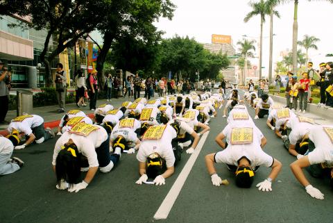 During the protest, a group of 120 people wearing white T-shirts and yellow headbands that read “Defend Losheng” walked in time with each drum beat and, at the sound of a cymbal, knelt down and touched the ground with their foreheads.