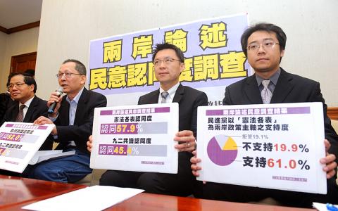 Chao said “two constitutions, different interpretations” was favored over the 1992 consensus, which was relatively unpopular among the 20 to 39 age group and in the south, because of its pragmatism and was seen as being better than the DPP’s past proposal of “name rectification and new constitution,” which many dubbed as provocative.