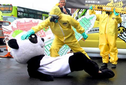 The skit also included a person dressed in a panda costume to mimic the Taipei Zoo’s panda cub Yuan Zai (圓仔) and a person holding a picture of President Ma Ying-jeou (馬英九), with a voice-over saying that even they could not escape from the radiation should an accident happen.