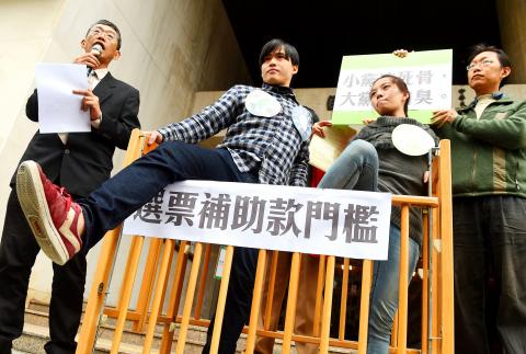 Yesterday’s rallying groups later set up a crib in front of the legislature building to represent the subsidy threshold and acted out skits to satirize the current system, which they said widens the wealth gap between political parties and produces an even more disproportionate ratio of legislative floor seats.