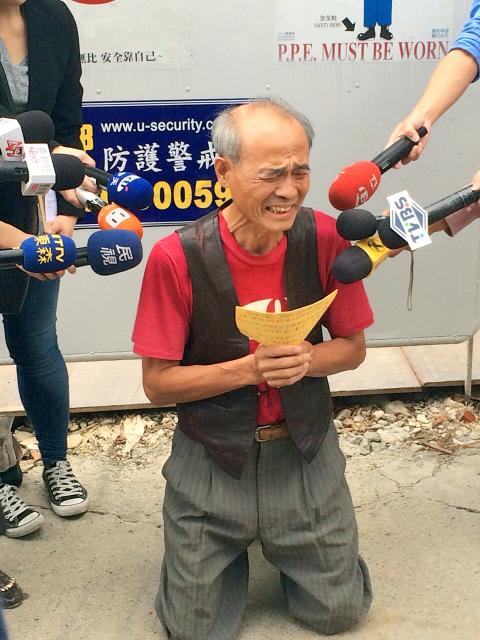 Luo emerged from his home at noon and, kneeling down, he read from a prepared statement, pleading to President Ma Ying-jeou (馬英九) and Taipei Mayor Ko Wen-je (柯文哲) to help protect his land.