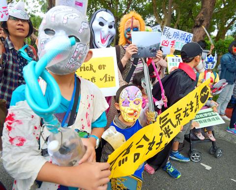 Members of the arts and humanities community, along with parents and children in Halloween costumes, made an appeal in front of the Presidential Office Building yesterday for the government to implement air purification measures.