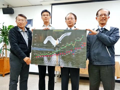 “The number of black-faced spoonbills in the world dropped below 300 in 1990, and the bird was placed on the [International Union for Conservation of Nature’s] red list of critically endangered species. That was when Taiwan began its conservation efforts, and those efforts have paid off. We are glad to see our ‘star species’ repopulate,” bureau Deputy Director-General Yang Hung-chih (楊宏志) said.