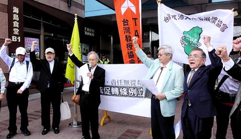 The Taiwan Association for the Care of the Victims of Political Persecution and other human rights groups held a news conference in front of the DPP’s headquarters in Taipei to call for swift passage of the bill.