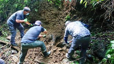 Police are investigating the death of a Formosan black bear discovered on Tuesday buried near an industrial road in Nantou County, with initial evidence indicating that it was shot accidentally by a hunter. The bear had been caught in wildlife traps at least five times before, three times since 2020. Codenamed No. 711, the bear received extensive media coverage last year after it was discovered trapped twice in less than two months in the Taichung mountains. After its most recent ensnarement last month, the bear was released in the Dandashan (丹大山) area in Nantou County’s Sinyi Township (信義). However, officials became concerned after the