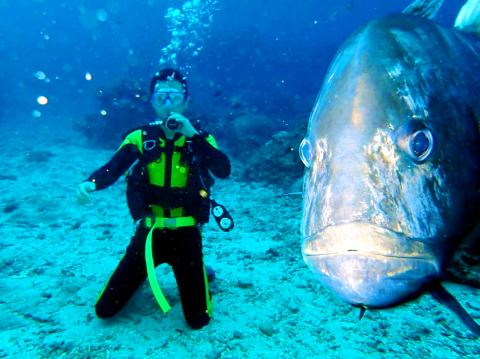 A giant trevally in the Shilang Diving Area near Green Island (綠島) has won the hearts of divers, with local diving businesses and residents calling on visitors not to harm the fish and to protect the area’s latest maritime star.