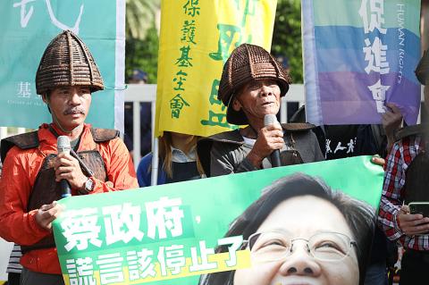 “We will not take a penny of the compensation, as we can catch fish and grow sweet potatoes to feed ourselves,” Tao elder and anti-nuclear power campaigner Capen Nganaen said yesterday at a protest in front of the Executive Yuan in Taipei, accompanied by environmental protection groups.