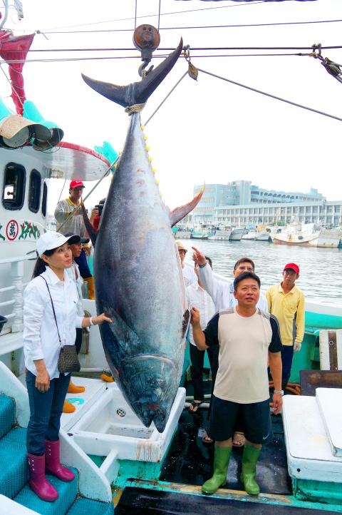 Fishing boat skipper Hsu Tsung-ming, right foreground, stands next to the first tuna of the season, which was landed at Donggang harbor in Pingtung County yesterday.Apr 22, 2013