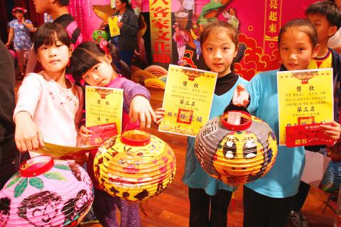 Children pose yesterday with hand-painted lanterns in Toufen Township, Miaoli County, at an event to publicize the three-day Toufen Hakka Cultural Festival, which starts on May 17.Apr 27, 2013