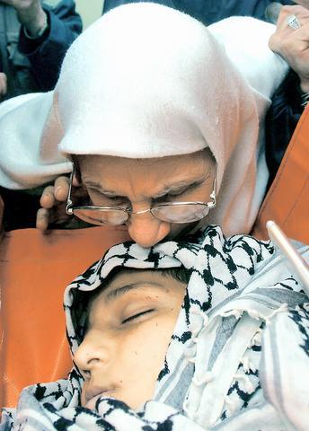 The boy's mother bowed over his body and kissed his forehead before burial.