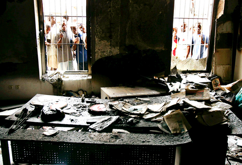 The gunmen, dressed all in black and wearing masks, forced their way inside the center's steel gates and beat two guards before sending them running away, Kempf said, citing the guards' accounts. The gunmen then opened fire on the white, art-deco building and set fire to the first-floor library. The fire engulfed most of the building.