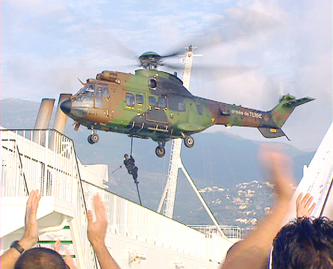 Five Puma helicopters carrying about 50 officers raided the Pascal Paoli, a combined cargo and passenger ferry run by the ailing, state-owned SNCM ferry company, which was lying off the Corsican port of Bastia after being commandeered by militant trade unionists in Marseille on Tuesday.
