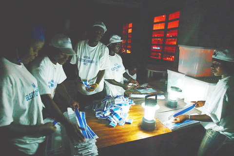 In one dank Monrovia schoolroom which served as a polling center, election officials counted ballots late into Tuesday night using battery-powered lanterns, 8,000 of which have been supplied to polling stations around the country.